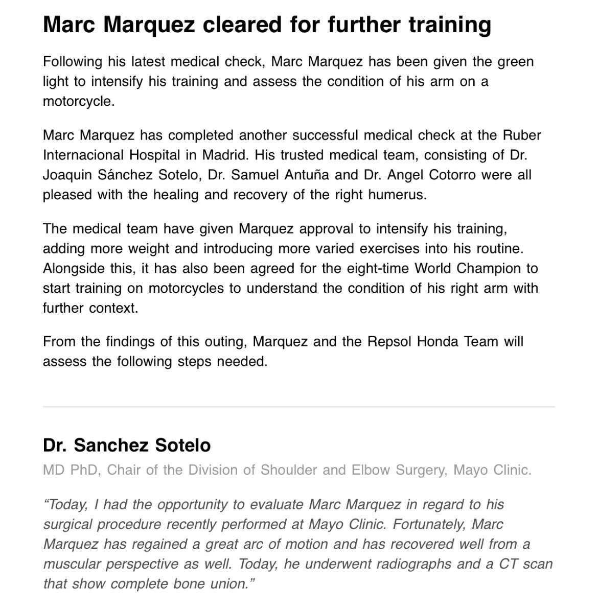 Marquezt június elején operálták sokadszor negyedszer is, Amerikában, május vége óta nem versenyzett, és motorra sem ülhetett. Az ellenőrzés során három orvosa megállapította, hogy felkarja “szépen javul, megfelelően mozog, elég izmos”, illetve a legfontosabbat,